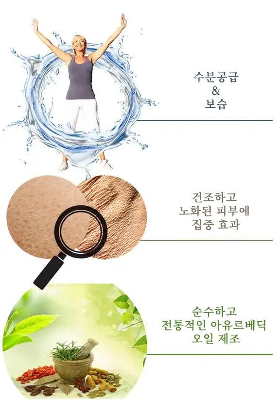저는 굉장히 건조한 지역에 살고 있는데, 이 오일은 정말 놀라운 효과를 보여줘요. 손과 발에도 함께 사용하고 있어요. 60대인 지금도 피부 좋다는 칭찬을 정말 많이 들어요. 아유르베다 제품, 진짜 효과 있어요!